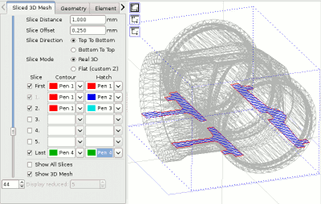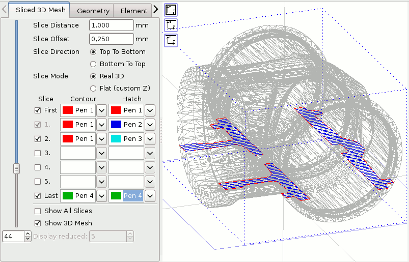 - Variable pen definitions for contour and hatch can be defined freely for first and last slice as well as pen-patterns for all other layers