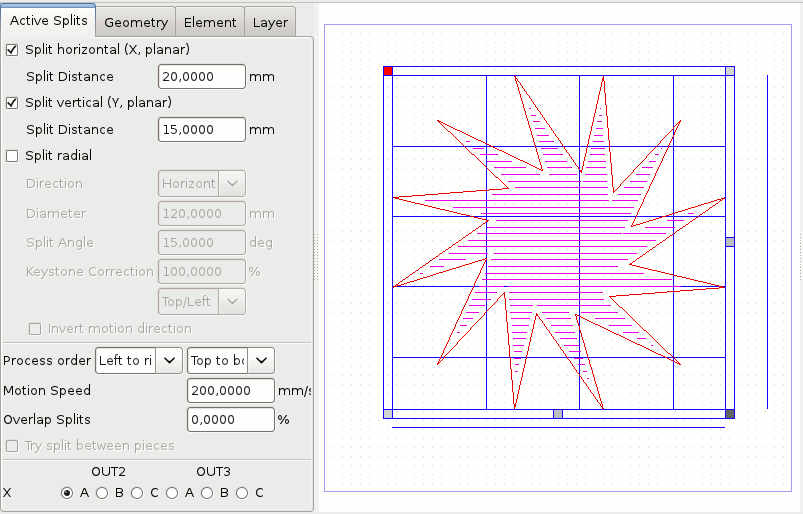 - Geometries can be splitted one-dimensional (X or Y direction or rotational mode) or two-dimensional
